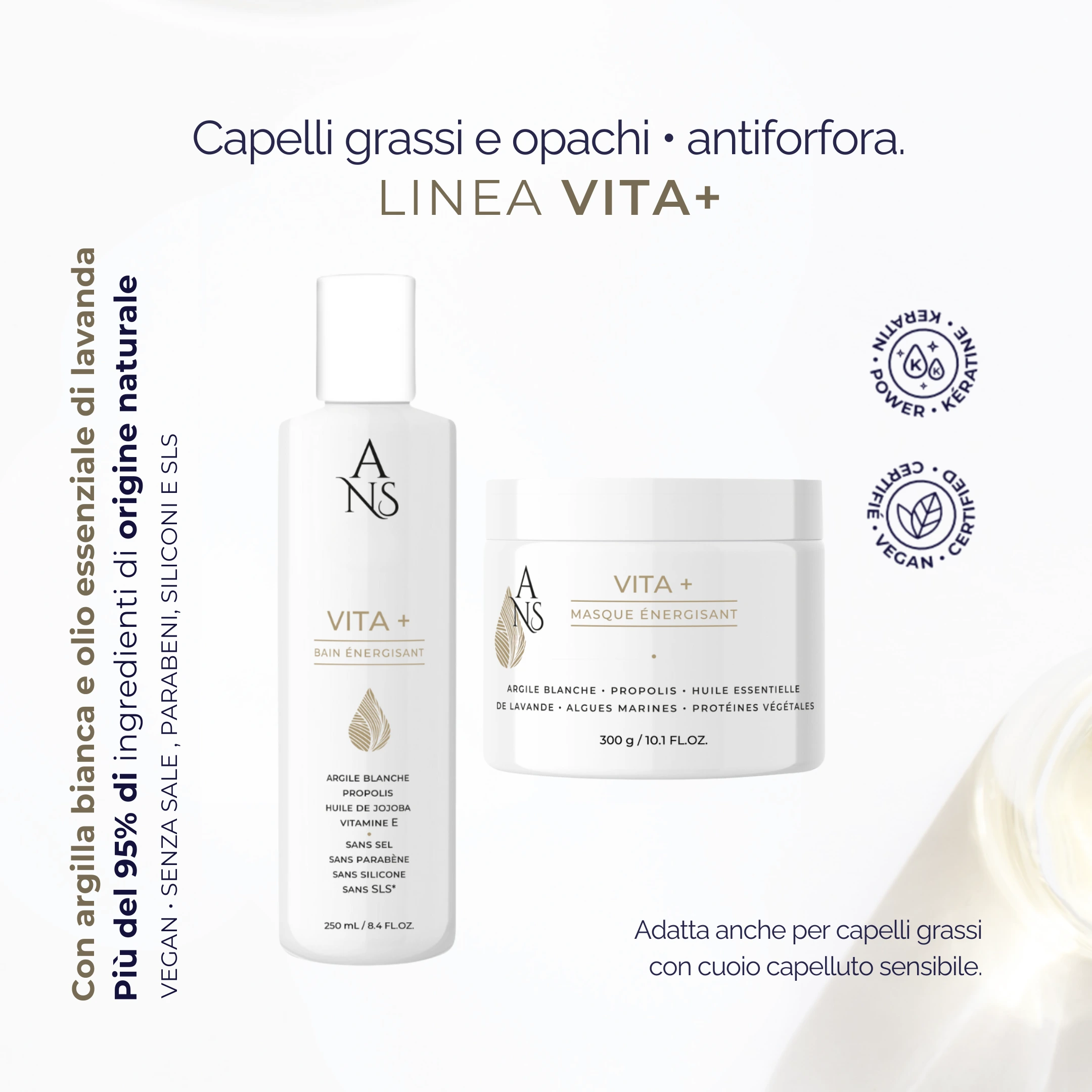 Il + del prodotto: la sua formula a base di argilla purifica il cuoio capelluto grasso, la propoli purifica e regola la produzione di sebo, associata ad alghe marine ricche di vitamine, sali minerali e oligoelementi per un’idratazione ottimale della fibra capillare.