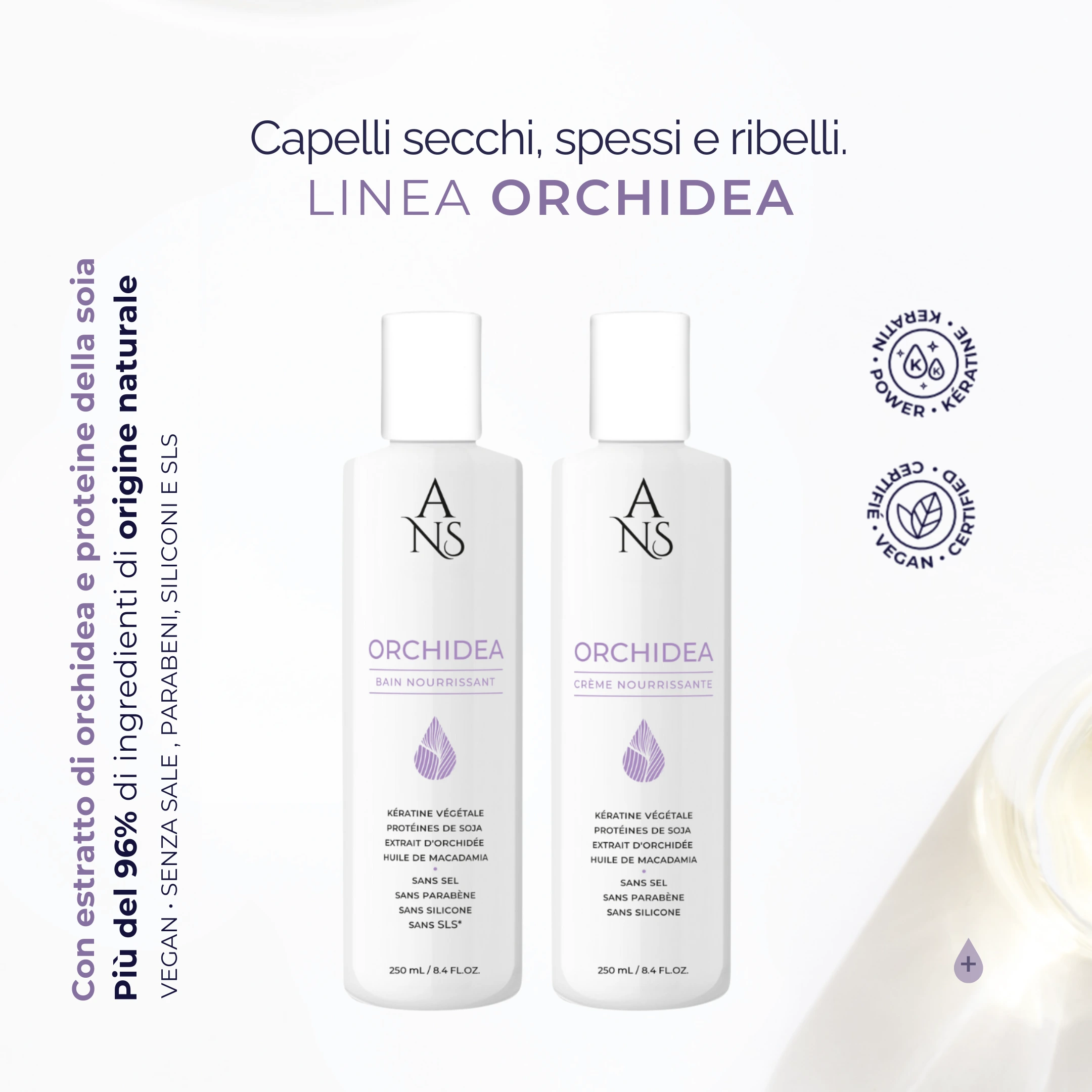 - Estratto di Orchidea: idratante e ammorbidente naturale, ha proprietà antiossidanti e agisce come un anti-età per i capelli, proteggendo e rigenerando la fibra capillare.